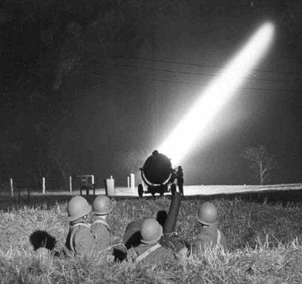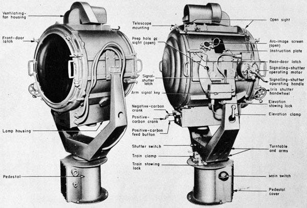 Large Army searchlights were familiar to residents in the Los Angeles area. Originally developed for spotting enemy aircraft, they had giant 60” reflectors and their beams could be seen for miles. They were used all around the LA area to attract attention for movie premieres, grand openings, car lots and the like. The Army lights were big and cumbersome but smaller 24” Naval signal lights were ideal for what John had in mind. He intended to use them on stage for special effects.