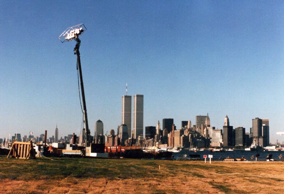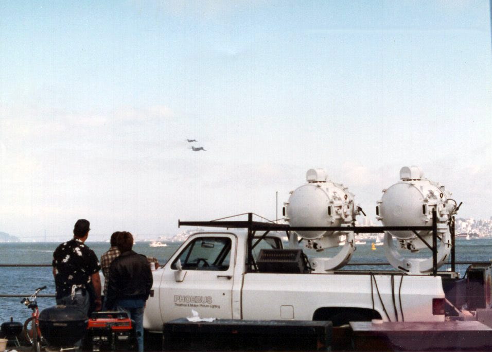 By 1979 we’d outgrown our location on Bluxome street and moved further south on 3rd street. No more railroad car loading dock, no more rickety freight elevator. We had a couple of warehouses and a yard to work with now. When we loaded the truck for New York, we added a new type of searchlight. We had acquired four Skytracker units, each with four 2000 watt Xenon lamps. When they rotated, the beams described a four leaf clover pattern in the sky. Not quite as bright as the arc lights, they still had plenty of punch, and we included them for the Liberty Island setup. We also packed a number of single head Xenons to use as needed. The equipment filled a 45’ trailer. We waved good bye and good luck to Doug, our driver, and he set off on the cross country trek that would end on an island in New York City.