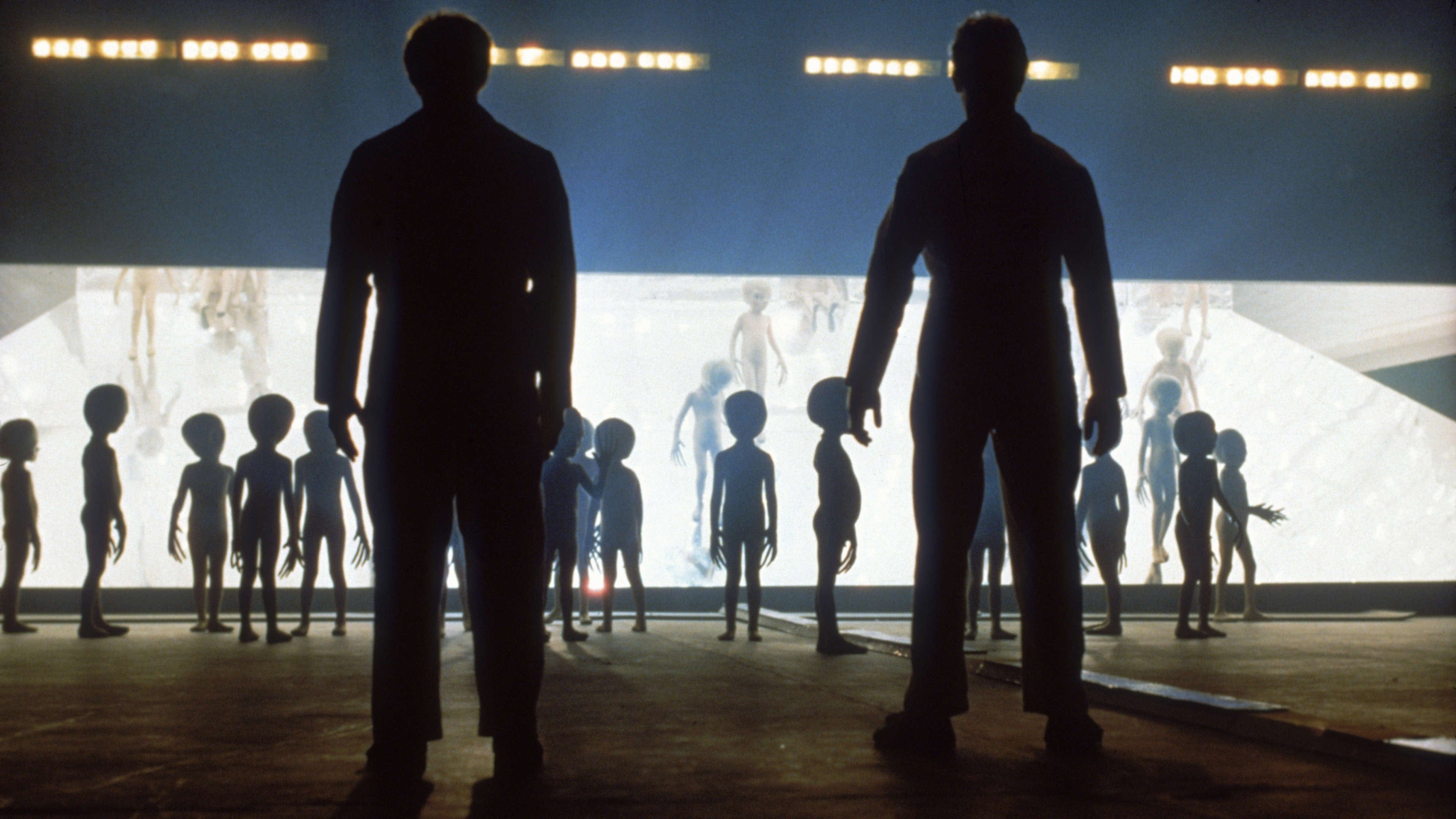 For the final scene, Vilmos had his grips suspend the searchlights above a reflective ramp, aiming down. The beams of light bounced off the ramp, creating an effect that silhouetted the aliens as they decended from their ship.