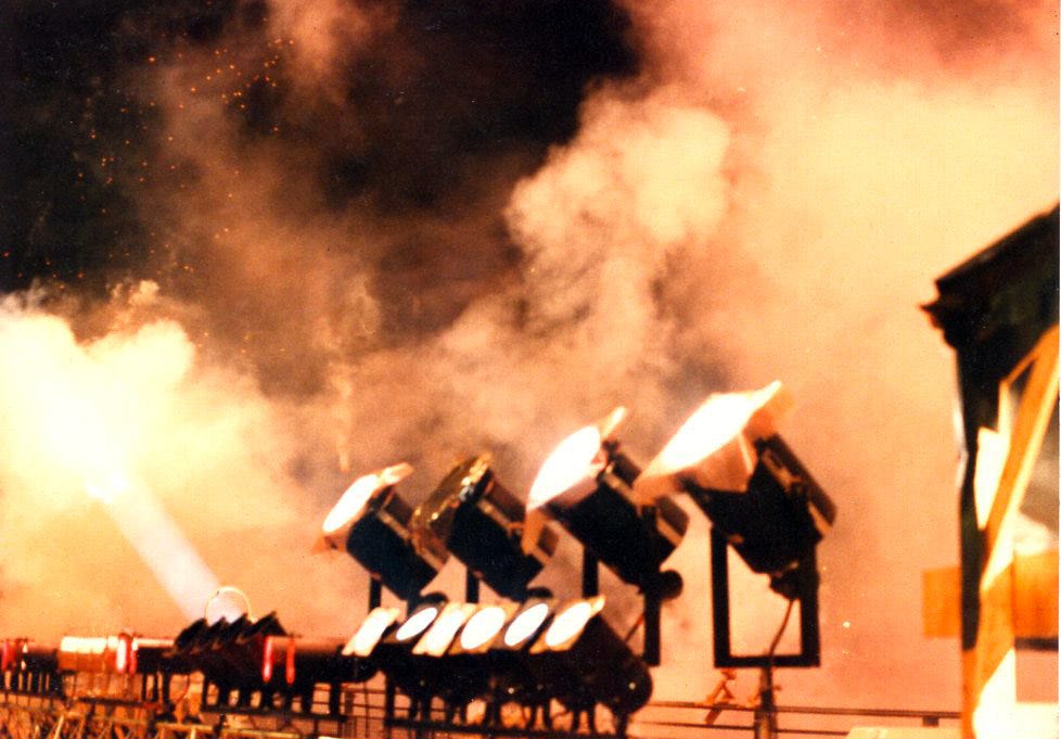 Phoebus didn’t have much inventory at first. John had made a name for himself in the early days of rock and roll touring- he’d done the lighting for Bette Midler and the Pointer Sisters and even an early Rolling Stones tour, so there were odds and ends in road boxes, but not much. What he did have was a collection of eight, 1940s era 24” Naval Searchlights he’d picked up at a surplus sale. Painted in a nasty Rustoleum yellow and mounted in rolling boxes, they stood on one side of the warehouse like a line of bedraggled sailors. These were carbon arc lights. They contained a mechanism that held and advanced a positive and a negative stick of carbon. When energized, an arc of electricity jumped the short gap between the carbons creating an intensely bright light. A highly polished Alzac reflector collated the light into a beam which could be seen, depending on the weather, for well over a mile.